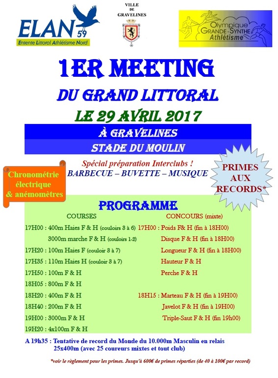 L'ELAN59 et l'OGSA se réunissent pour vous proposer le 1er meeting du Grand Littoral à Gravelines le 29 Avril à partir de 16h00.